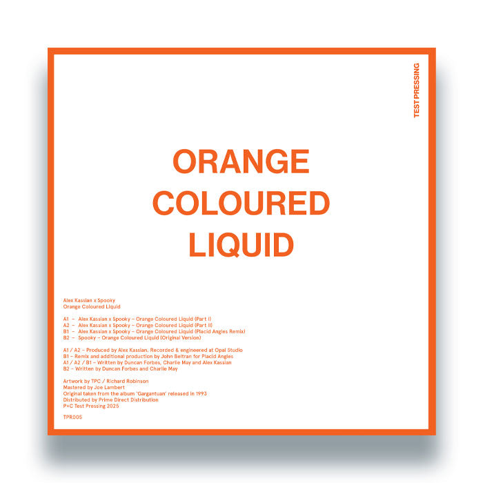 Following on from last year's massive E2-E4, Alex Kassianreturns to Test Pressing Records with the next in the rework series. This time tackling Spooky's 'Orange Coloured Liquid' taken from their seminal debut LP, Gargantuamreleased in 1993. Spooky, alongside acts like Underworld and Leftfield were at the forefront of the burgeoning progressive house scene at the turn of the 90's. Now 32 years later, man of the moment, Alex Kassian has proved once again that he can do no wrong with two versions that run from the club to the home. John Beltran also makes welcome appearance under his Placid Angles alias and the original version rounds off the release.