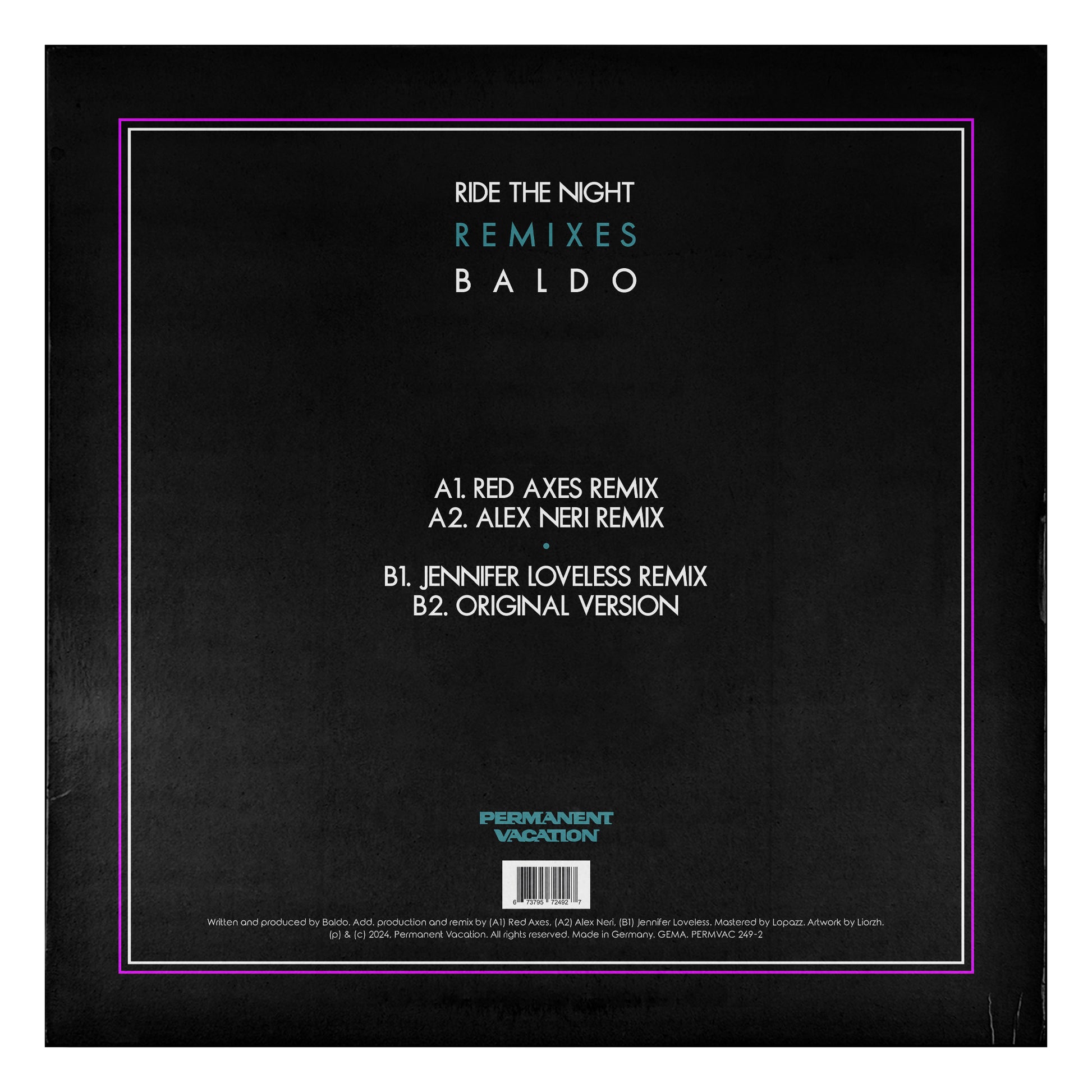 "Ride The Night" on vinyl is a must-have for any discerning DJ or electronic music aficionado, serving as a testament to the enduring power of Baldo's music and the boundless creativity of the remixers involved.