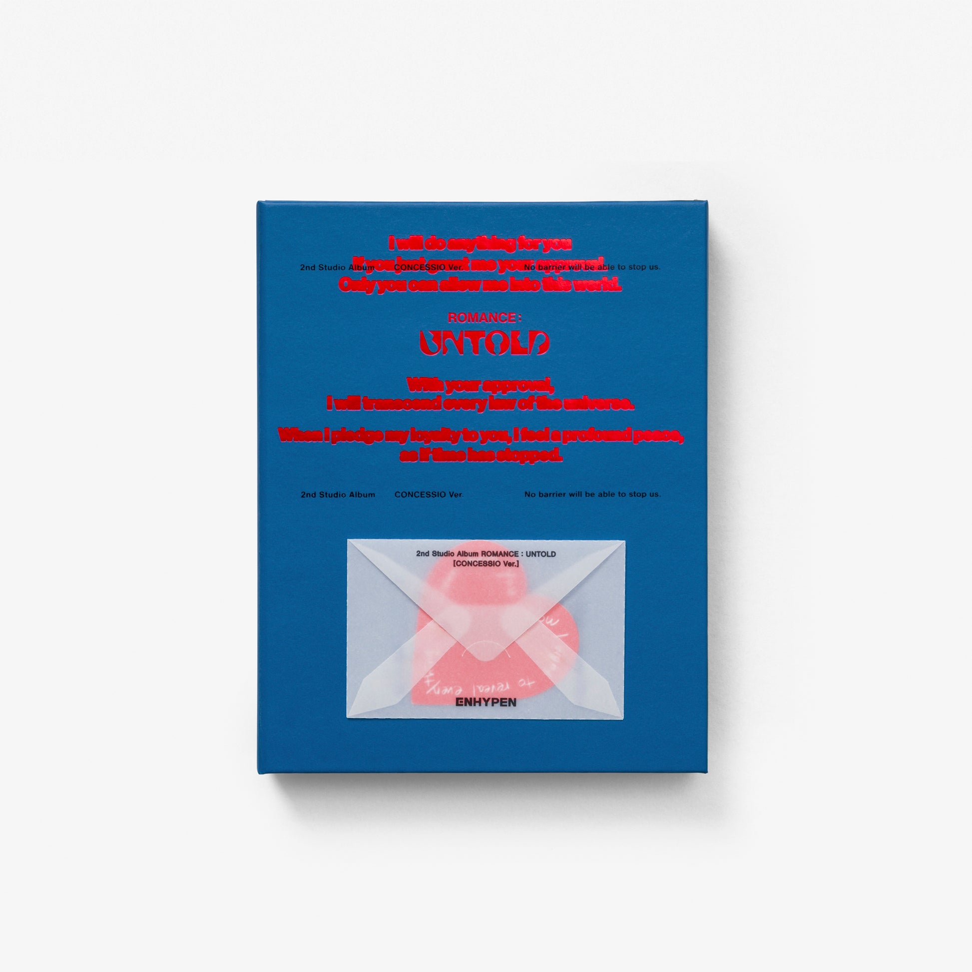 The powerhouse of K-POP, ENHYPEN (JUNGWON, HEESEUNG, JAY, JAKE, SUNGHOON, SUNOO and NI-KI) are back with a new series starting out with 'ROMANCE : UNTOLD', Available in three versions: INCEPTIO Ver., ARCANUM Ver., and CONCESSIO Ver.. Contents include: CD, Out Box, Letter, Photo Book, Photo Card A (random 1 of 7), Photo Card B (random 1 of 7), Sticker, Album Logo Sticker, Postcard (random 1 of 7), Paper Rings (random 1 of 7), and Poster. Dimensions: 189 x 150 x 32 mm.