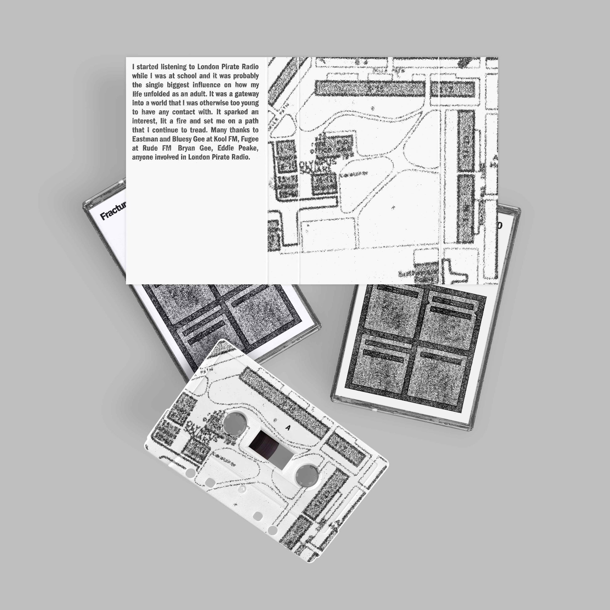 0860 is presented via an 8-track, DJ-friendly 2 x 12" Vinyl Album, 19-track mixtape cassette and the radio station 0860.fm, which is broadcasting now. There is also a Pirate Radio Art Print from UTILE and T-Shirts. Broadcasting now on 0860.fm is an additional 90-min 'Signal Test' ambient album by Fracture.