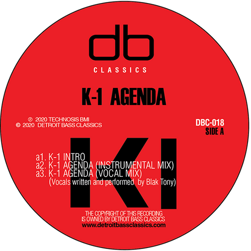 3) "K-1 Agenda" (Vocal Mix) -Written and executed by longtime cohort, 'Blaktony' (AUX88, Alien FM) on vocals. The tune transforms into a classic global jam with android-like vocals planted between the hand-crafted Detroit electronic backdrops. A mainstay in electro bass crates since its release, this track is the description of a man on a mission to jam this world and beyond. Rubbery 'K-1' signature bass lines and strings ride the perfect beat.