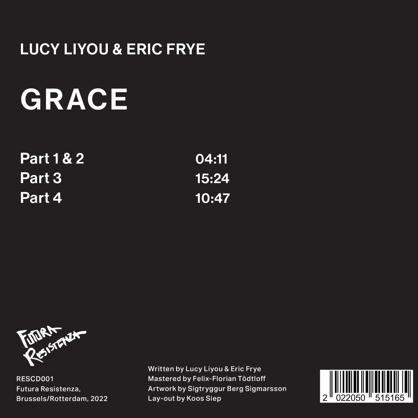 Grace is the beautiful result of a covalent bond forged between Frye and Liyou, with the boundary lines blurred and fingerprints overlapping throughout the piece's duration. The duo swapped files and ideas throughout 2020 and 2021, continuously editing and resculpting a wide range of stem audio files and source sounds into the four-part piece. Flashes of mundane and momentous memories rub up against confused robotic text-to-speech snippets and shimmering processed noises. This piece is a substantial realization of both artists' worlds, and sees their approaches coming together to create something complementary and fresh, that neither could have made alone. Grace is a piece about tackling life's messy and winding path, inspired by anits erratic mix of fear and love. (Tristan Bath)