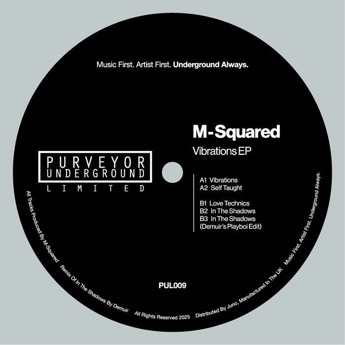 US artist M Squared brings his inimitable style to the latest Purveyor Underground release. As soon as you drop the needle on 'Vibrations' you're in a fresh world of jazzy samples, swinging drums and smeared melodies with spoken words adding extra layers to what is a full flavour jam. 'Self Taught' is another filter-style jam that harks back to the 90s French touch scene and 'Love Technics' brings jacked-up drum funk and insistent loops that never let up. There is more room to breadth with the deeper, smoky sounds of 'In The Shadows' while label boss Demuir's Playboi edit jacks it up with more funky bass.