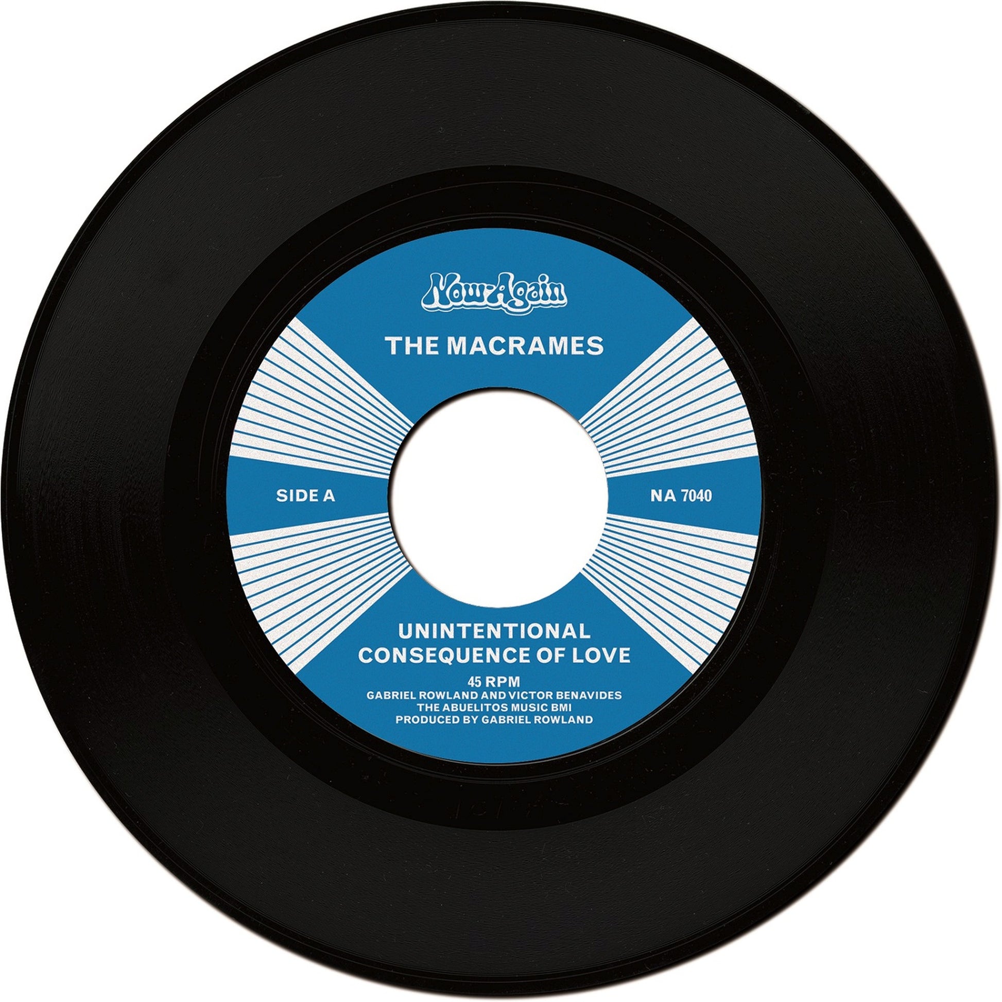 Three 7″ Singles By Trish Toledo, Los Yesterdays, The Macrames: Chicano “souldies” On Now-Again Records Produced By And Written By Gabriel Rowland and Victor Benavides. The Macrames, with Benavides channeling his inner Al Green, invokes the early 70’s soul sounds of Memphis and Philly. Songs such as “Unintentional Consequences of Love” that tells the tale of a man who has unwittingly(and unwillingly) fallen in love and is living in denial. But as beauty is in the eye of the beholder, so love is in the heart of the “perceiver” and “So In Love With You” exemplifies this opposite perspective of someone reveling in the thrills of a new love. Originally a part of Los Yesterdays early set lists, these two tracks featuring the legendary Ozomatli horns were shelved when the band solidified their unique 50’s/60’s psychedelic soul sound, and so The Macrames were born.