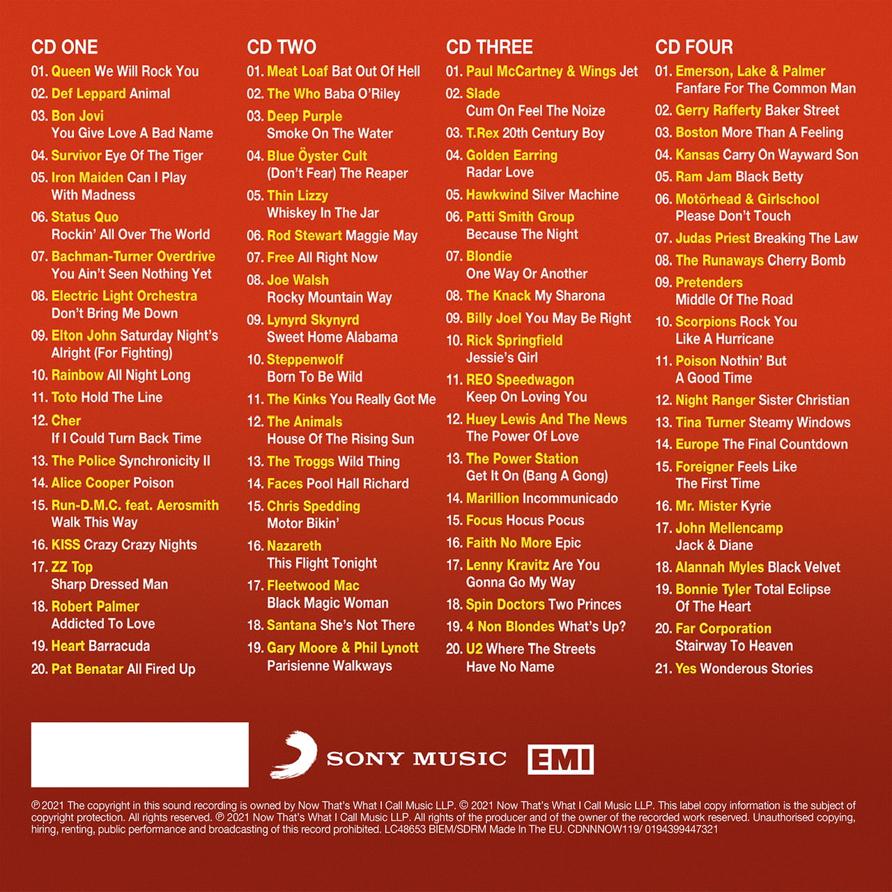 This 4CD compilation includes massive hits from British icons - Def Leppard, Elton John, Electric Light Orchestra, The Police, Iron Maiden, and Status Quo, together with stadium-filling anthems including Queen’s ‘We Will Rock You’, Survivor’s ‘Eye Of The Tiger’, and Bon Jovi with ‘You Give Love A Bad Name’.