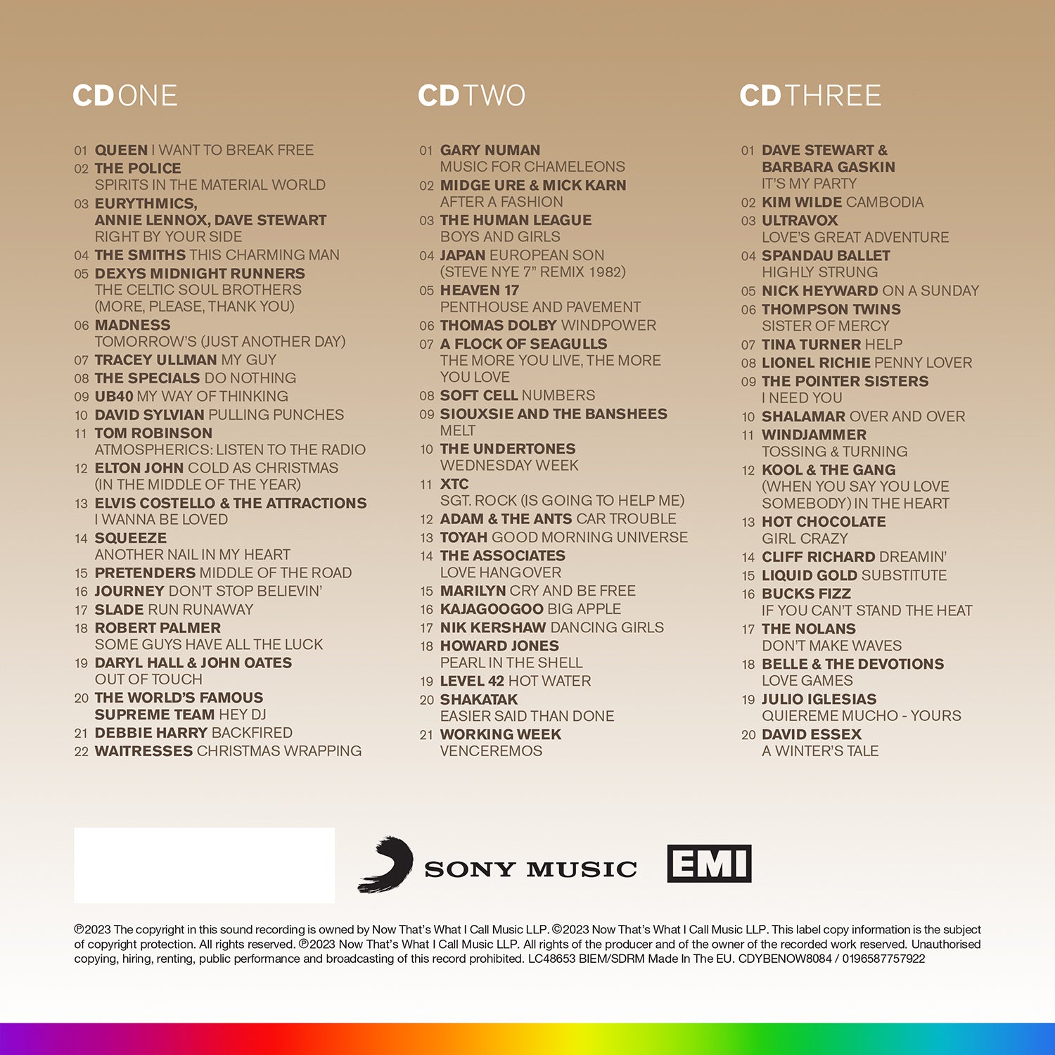 Disc One kicks off with the iconic ‘I Want To Break Free’ from Queen, before moving on to The Police, Eurythmics and ‘This Charming Man’ from The Smiths. Huge Pop hits from Madness, Dexys Midnight Runners, The Specials and UB40 lead into fantastic lesser compiled songs from David Sylvian, Elton John, Elvis Costello & The Attractions, and Tom Robinson, before some rock from Pretenders, Slade and the timeless ‘Don’t Stop Believin’’ from Journey – and signing off with classics from The World’s Famous Supreme Team, Debbie Harry, and the sublime seasonal favourite from Waitresses.