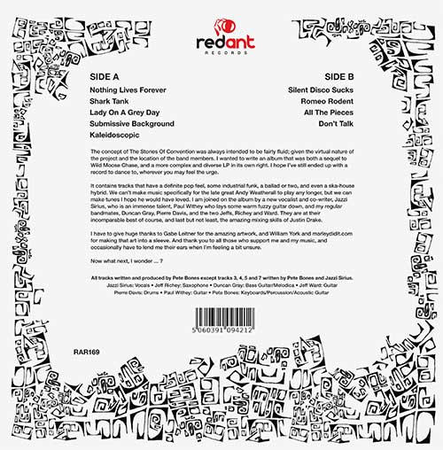“The concept of The Stones Of Convention was always intended to be fairly fluid; given the virtual nature of the project and the location of the band members. I wanted to write that awkward second album that was both a sequel to Wild Moose Chase, and a more complex and diverse LP in its own right. I hope I've still ended up with a record to dance to, wherever you may feel the urge. It contains tracks that have a definite pop feel, some industrial funk and even a ska-house hybrid. We can't make music specifically for the late great Andy Weatherall to play any longer, but we can make tunes I hope he would have loved. I am joined on the album by a new vocalist and co-writer, Jazzi Sirius, who is an immense talent, Paul Withey who lays some warm fuzzy guitar down, and my regular bandmates, Duncan Gray, Pierre Davis and the two Jeffs, Richey and Ward. They are at their incomparable best of course, and last but not least, the amazing mixing skills of Justin Drake.”