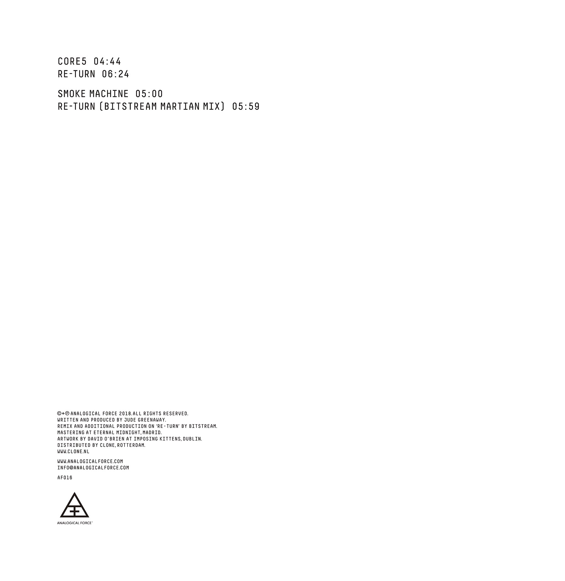 Jude Greenaway joins Analogical Force with 'E.OneSeven EP'. Some might already know ScanOne from past releases on Combat Recordings and Yellow Machines. Intricate breakbeat treatments with crisp electronica melodic edits, twisted future hardcore and London-bred basslines...the sound of ScanOne in 2018. On the b-side the Conner brothers reappear after a long silence as Bitstream, to twist 'Re-Turn' into the darker dystopian side. Fans of solid underground music take note.