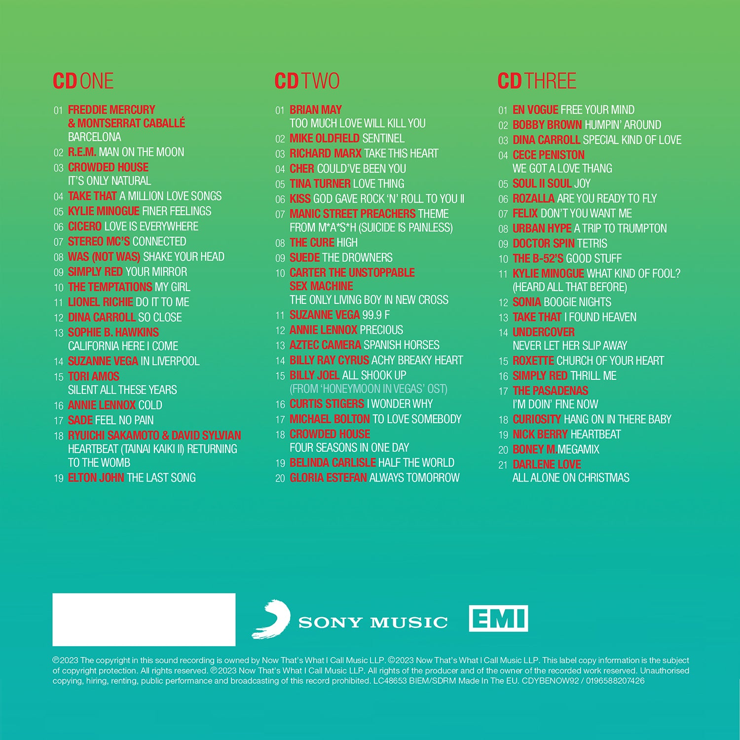 The first disc opens with giants of their genres - Freddie Mercury and Montserrat Caballé and their incredible collaboration ‘Barcelona’ - which reached its peak No. 2 position in 1992. Alt Rock from R.E.M. and Crowded House follow, together with the Gary Barlow-written ‘A Million Love Songs’ from Take That and Kylie Minogue’s ‘Finer Feelings’ remixed for single release by Brothers In Rhythm. ‘Connected’ gave Stereo MC’s their first top 20 hit, while The Temptations’ ‘My Girl’ enjoyed a resurgence upon its re-release. Up next are ballads from Lionel Richie with ‘Do It To Me’ and Tori Amos with her gorgeous track ‘Silent All These Years’. Sade’s ‘Feel No Pain’ leads into the disc’s closing track, Elton John’s poignant ‘The Last Song’.