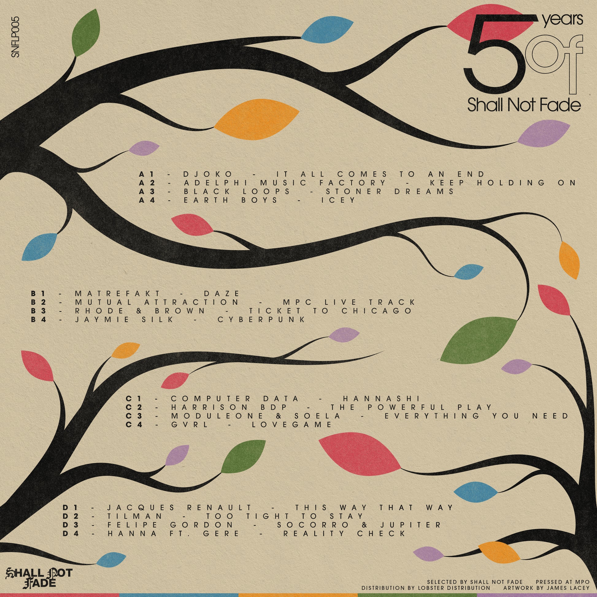 Bristol based record label Shall Not Fade celebrate 5 years of existence by curating a double LP featuring new unheard tracks from label family members, new and old.