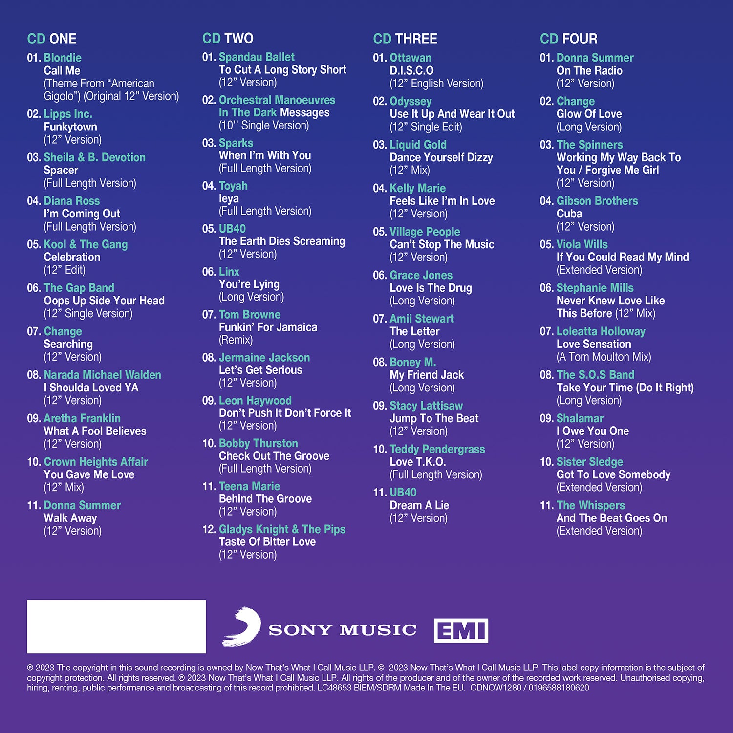 As the decade opened, Disco was the dominant chart genre, and ‘NOW 12” 80s: 1980’ brings together 12” versions of huge Disco hits from Lipps Inc, Grace Jones, Change, Odyssey, Donna Summer, Gibson Brothers, and Kool & The Gang. Sheila & B. Devotion, Diana Ross and Sister Sledge all enjoyed massive success with production and writing from Nile Rodgers and Bernard Edwards from Chic and Pop smashes became Disco gold from Liquid Gold, Village People, Kelly Marie and the aptly titled ‘D.I.S.C.O.’ from Ottawan.